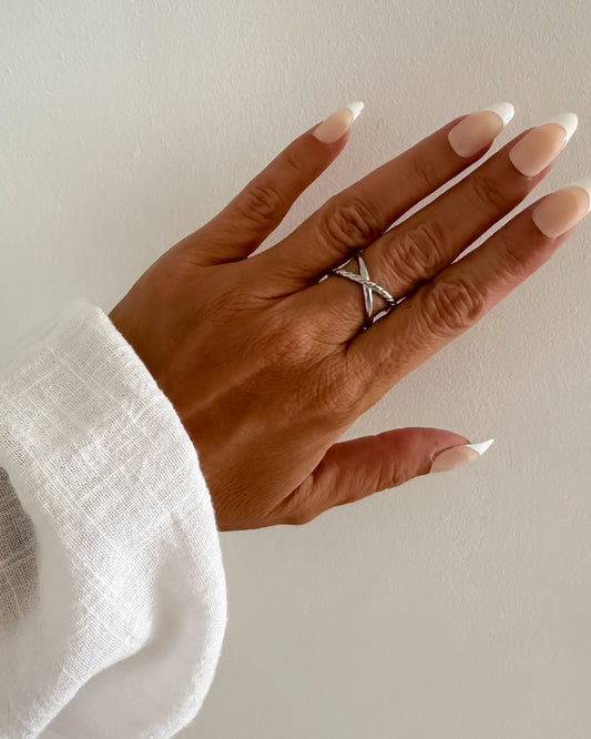 Anillo abierto ajustable en forma de cruz con textura acero acabado rodio Tori Silver