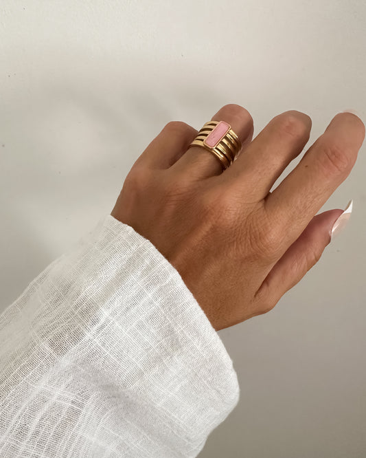 Anillo ajustable piedra rosa rectangular en acero baño oro 18K Bella Rosa