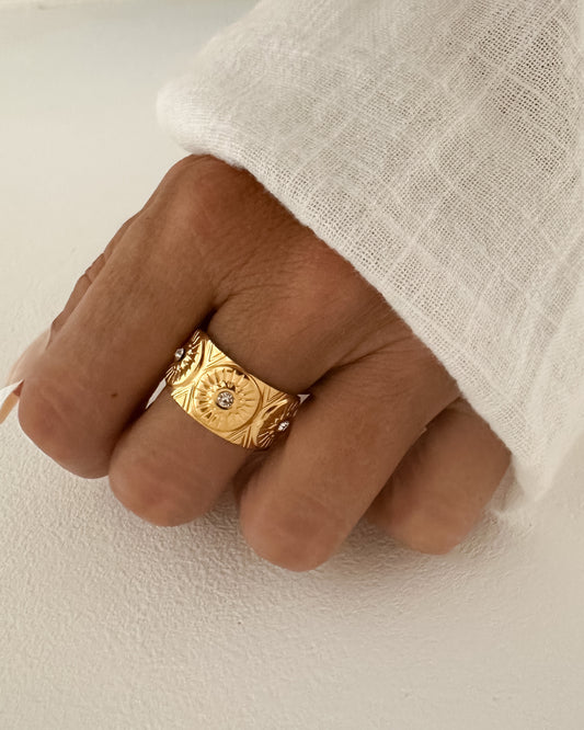 Anillo ajustable diseño sol con circonita en acero baño oro 18 K Cuzco