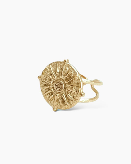 Anillo ajustable estilo sello con diseño sol textura en acero con baño oro 18K Arverno