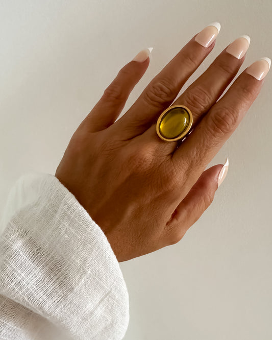 Anillo cabujón resina verde oliva en acero baño oro 18K Oglio