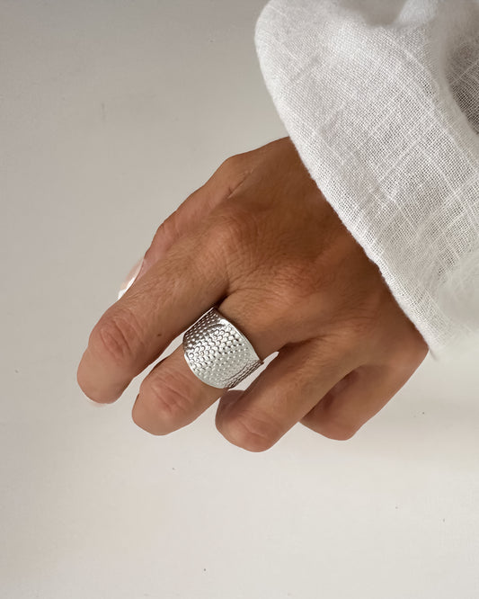 Anillo ancho textura puntos en acero baño rodio Kai Silver
