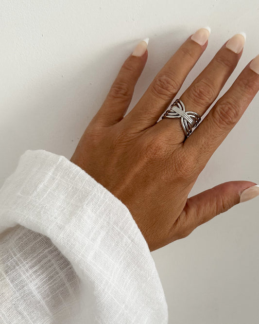Anillo diseño ondas simétrico en acero inoxidable baño rodio Lace Silver