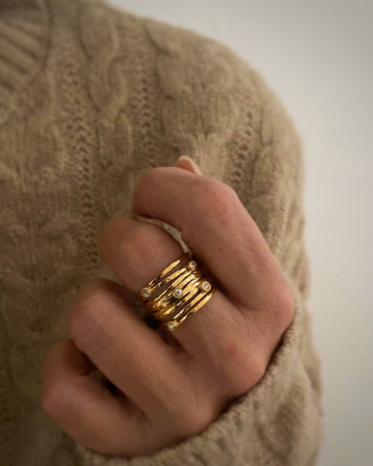 Anillo bandas cruzadas textura y circonitas acero baño oro 18K Paula