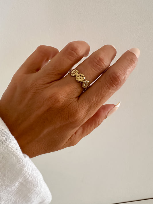 Anillo fino ajustable diseño flores en acero baño oro 18K Flores