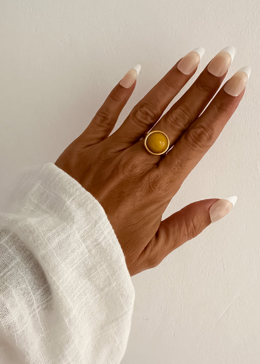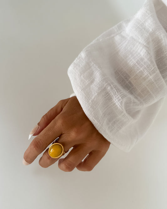Anillo piedra redonda amarillo oscuro en acero baño oro 18K Basile Mango