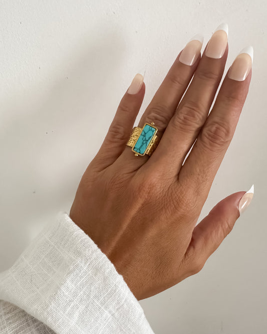 Anillo piedra grande rectangular turquesa acero baño oro 18K Aramis