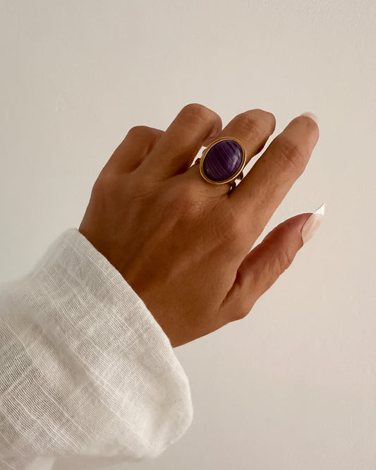 Anillo piedra grande morada en acero inoxidable baño oro 18K Bembergy