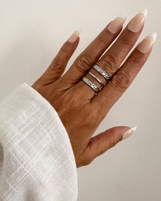 Anillo tres bandas martilleado en acero inoxidable con baño de rodio Dune Silver