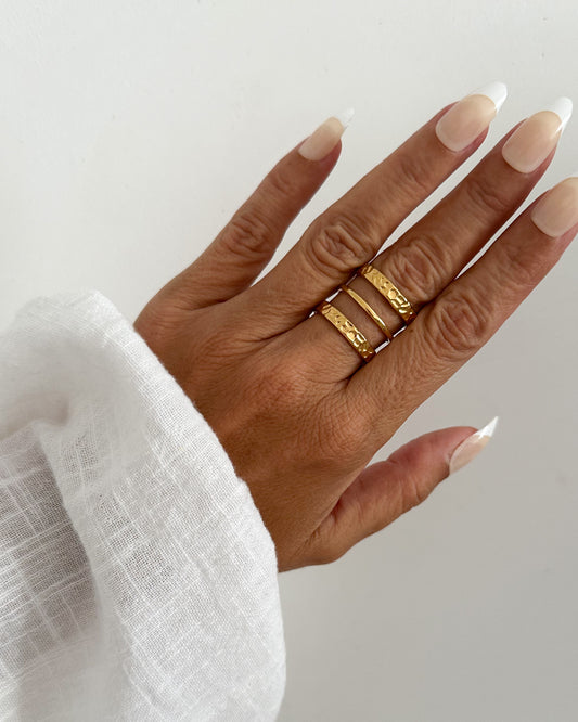 Anillo tres bandas martilleado en acero inoxidable con baño de oro de 18K Dune Gold