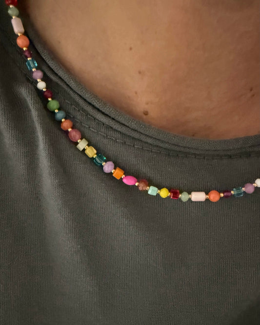 Collar de cuentas piedra natural y cristal acabado acero baño oro 18K Petite