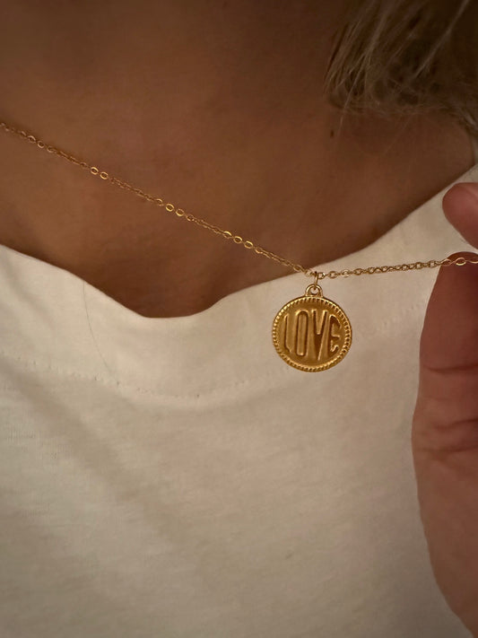Collar colgante medalla con letras en acero baño oro 18K Love