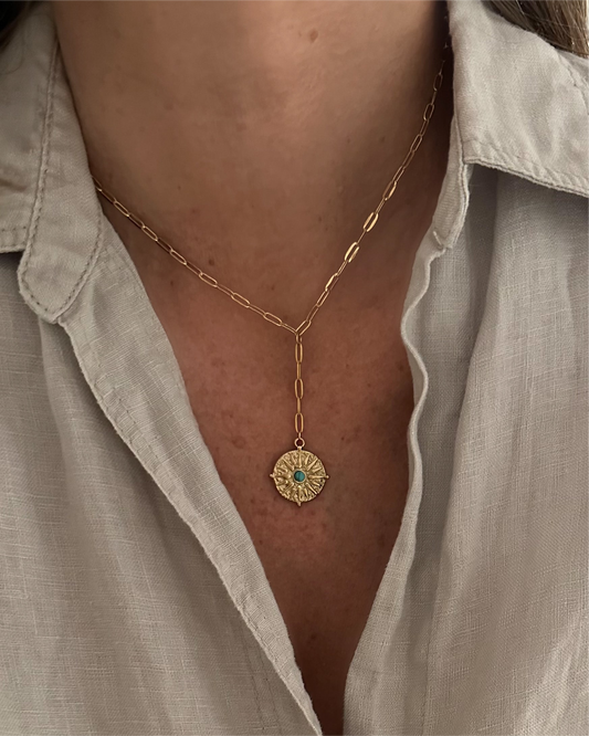 Colgante estilo corbata con medallita oro mate detalle turquesa Roseta
