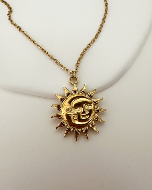 Collar de cadena forzada con colgante grande diseño sol y luna en acero baño oro 18K Vida