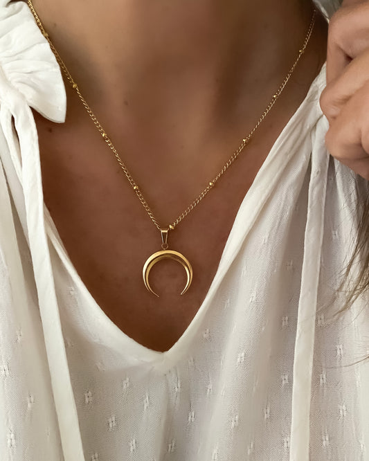 Collar cadena bolitas con colgante de luna invertida en acero baño oro 18K Lúnula