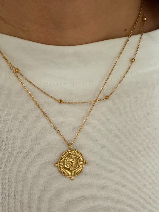Collar doble con colgante medalla étnica textura en acero baño oro 18K Anjara