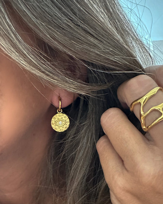 Aritos con charm grande circonita en acero baño oro mate 18K Ojos Circonita