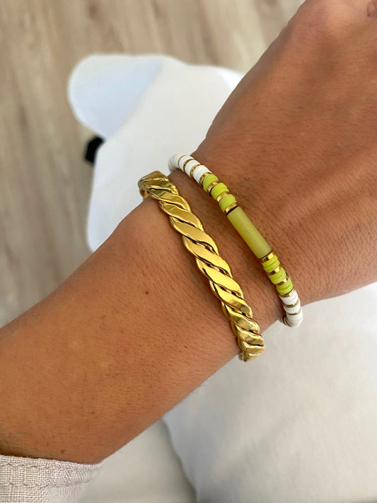 Pulsera cuentas disco tonos blanco y lima acabado acero oro Lima