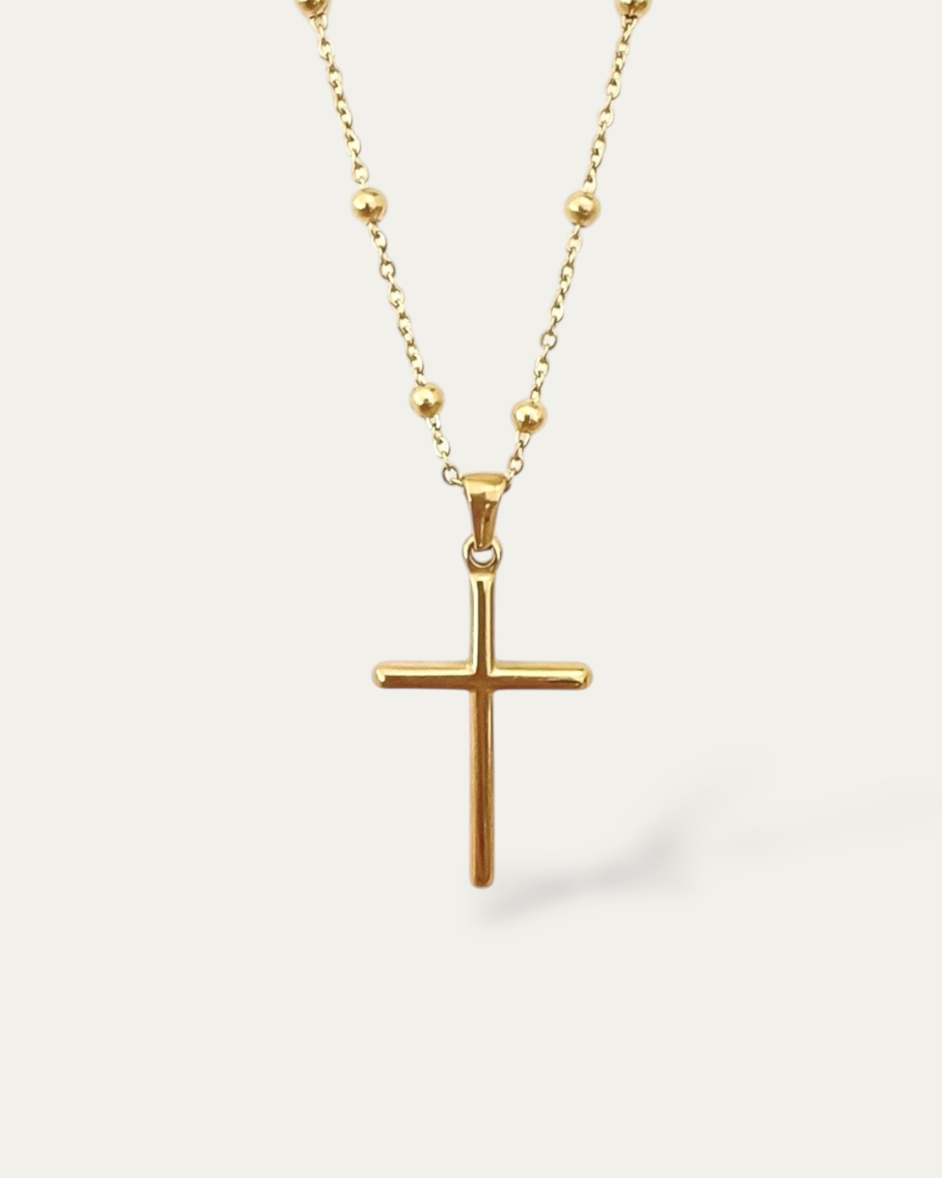 Collar cadena de bolitas con colgante de cruz estilo clásico en acero baño oro Rosario