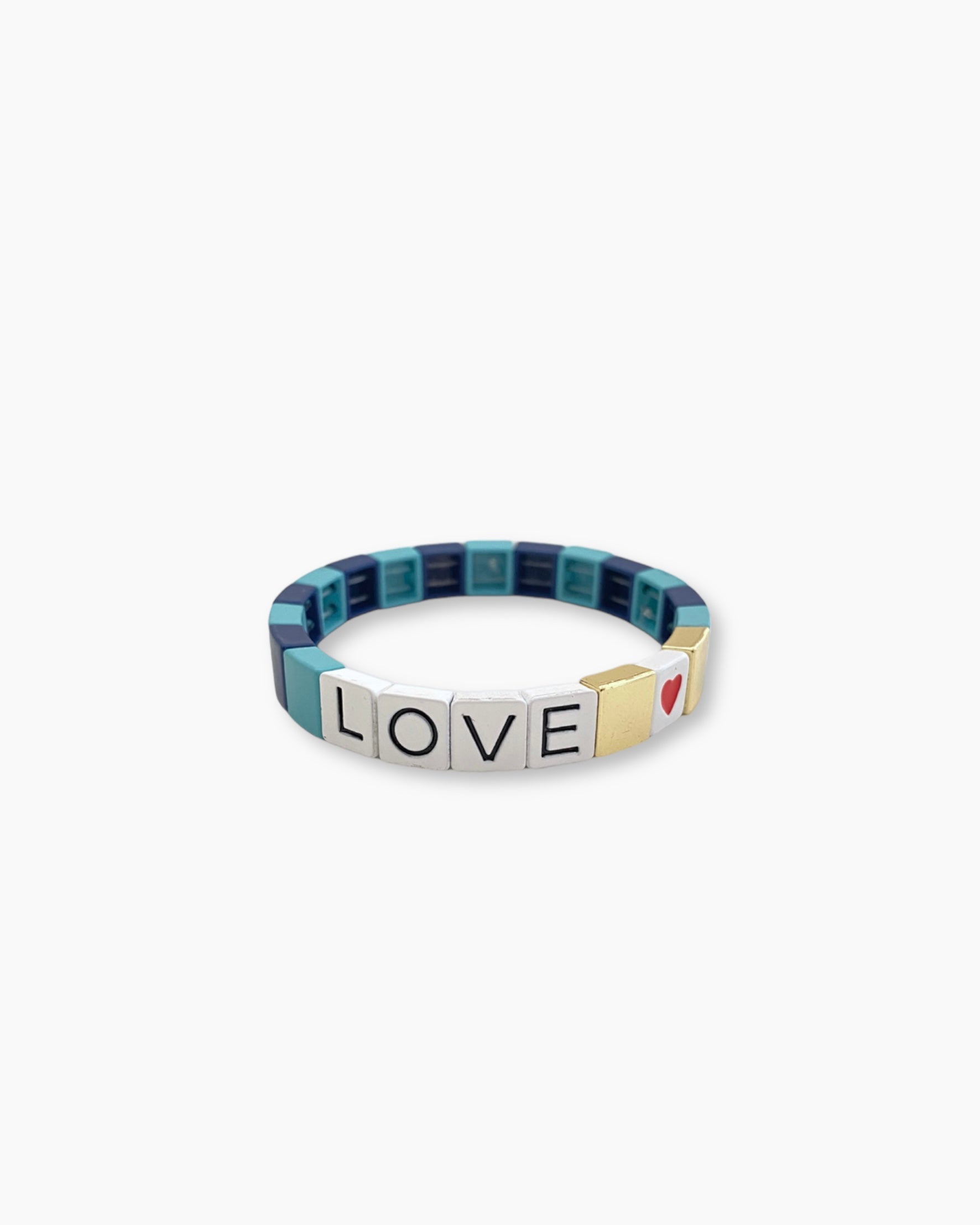 Cada PULSERA BLOCK es única y está diseñada para ser cómoda y fácil de usar en cualquier ocasión. Las cuentas de metal enamel en tonos azules le dan un aspecto vibrante y atractivo, mientras que la palabra "LOVE" refleja el mensaje positivo y amoroso que esta marca desea transmitir.